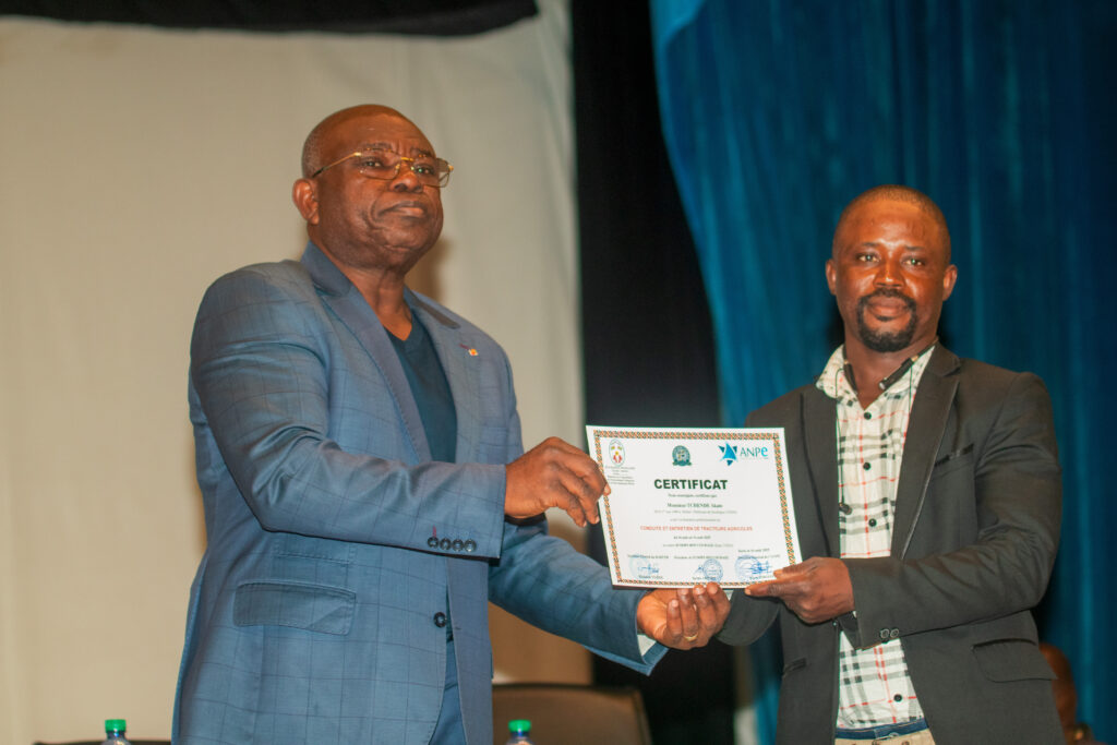 Ces jeunes ont bénéficié d’une formation professionnelle certifiante en conduite et entretien de tracteurs agricoles, assurée par le Centre SCOOPS BON COURAGE de Kara pendant de deux (02) mois. Cette action de renforcement de compétences, rentre dans le cadre de la mise en œuvre des formations professionnelles directement liées aux opportunités économiques initiées par l’Agence nationale pour l’emploi (ANPE) en collaboration le ministère de l’agriculture, de l’hydraulique villageoise et du développement rural (MAHVDR).